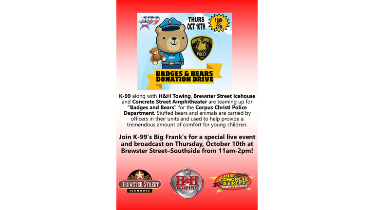 K-99 along with H&H Towing, Brewster Street Icehouse, and Concrete Street Amphitheater are teaming up for "Badges and Bears" for the Corpus Christi Police Department. Law-enforcement is on the front lines to keep our community safe, and at times help with children in unsafe situations. Stuffed animals are carried by officers in their units and used to provide comfort for young children. This can be a scary time for kids, and having a brand-new teddy bear can provide a tremendous amount of comfort.
